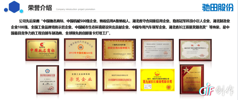 公司先后荣膺“中国驰名商标、中国机械500强企业、纳税信用A级纳税人、湖北省守合同重信用企业、隐形冠军科技小巨人企业、中国城市生态环境建设突出贡献企业、中国专用汽车领军企业、湖北省长江质量奖提名奖”等殊荣,是中国最具竞争力的工程自卸车上装集成和非公路宽体矿卡制造商,致力于打造全球领先的自卸重卡灯塔工厂。
